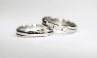 二つのラインが交差するイメージは「絆」。二人の人生がひとつの指輪で交わり重なっていくデザインにしました。女性の指輪には5つのダイヤモンドを埋め込み、エレガントなしあがりに。