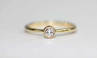 18金でダイヤモンドを埋め込んだまわりにはミル打ち加工をほどこしました。普段でも引っかからずに着けられるデザインです。