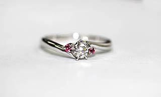 婚約指輪は、ダイヤモンドでなくてはならないという事はありません。誕生石や好きな宝石、その人への気持ちが大切だと思います。この指輪はハートカットのルビーを真ん中に留め、左右にダイヤモンドを入れました。