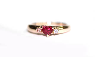 婚約指輪は、ダイヤモンドでなくてはならないという事はありません。誕生石や好きな宝石、その人への気持ちが大切だと思います。この指輪はハートカットのルビーを真ん中に留め、左右にダイヤモンドを入れました。